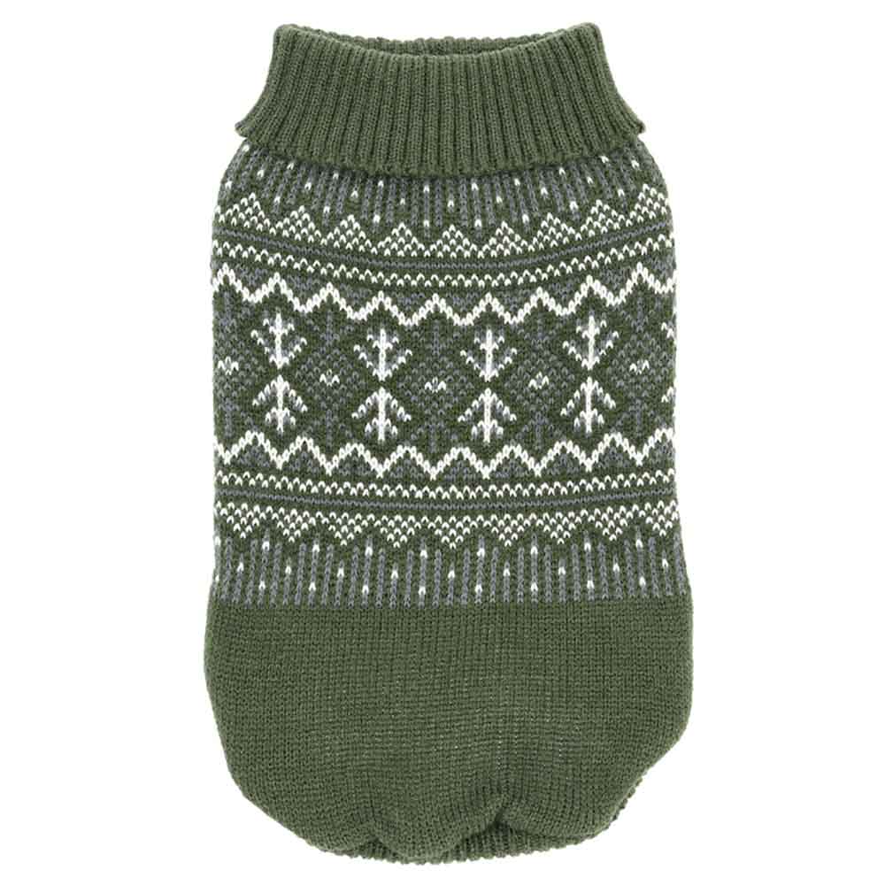 Wonderfully soft and cozy, knitted dog sweater with a collar - perfect for the dog that tends to get a bit chilly! The green, finely patterned sweater stays in place with the help of short cuffs around the front legs and leg straps at the hind legs.