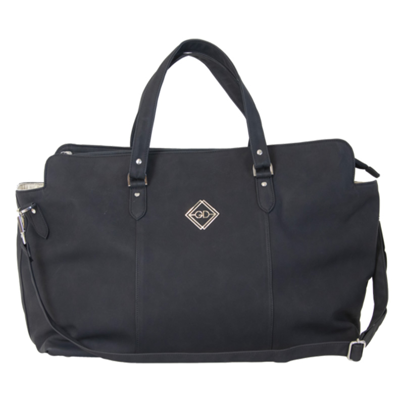 Stylish travel bag in black faux leather with a suede finish. Offers plenty of space for your belongings when you head to a competition or a lovely weekend getaway. It closes with a zipper and has a small pocket inside. Can be carried over the shoulder or by the handles.
