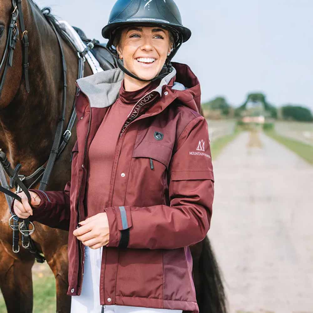 The Mountain Horse Royal Grace Riding Jacket is an updated version of their classic riding jacket, designed for women. This bordeaux jacket offers an attractive fit and functional features, perfect for riding. It is fully taped, waterproof, and breathable, making it ideal for all weather conditions. The jacket features a 2-way YKK® main zipper for adjustability, a detachable and adjustable hood for good sideways visibility, adjustable sleeve flap and inner cuff for extra warmth, multiple secure pockets, and riding slits at the back.