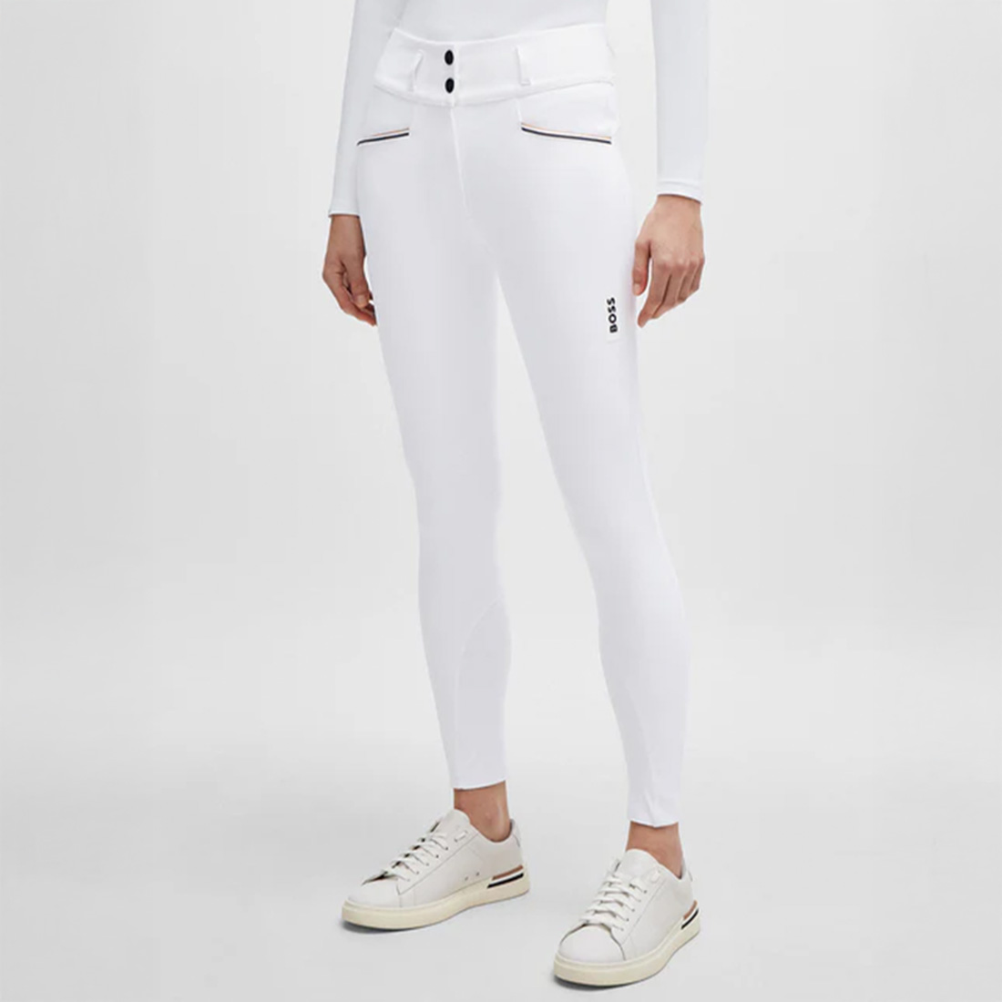 The BOSS Equestrian Hannah Knee Grip riding breeches for women come in a sleek white color. These breeches feature a high waist and knee grip for added support and comfort while riding. Designed with the BOSS logo on the left leg, the black version includes a practical mobile pocket. With 4-way stretch, they offer great freedom of movement and an optimal fit.