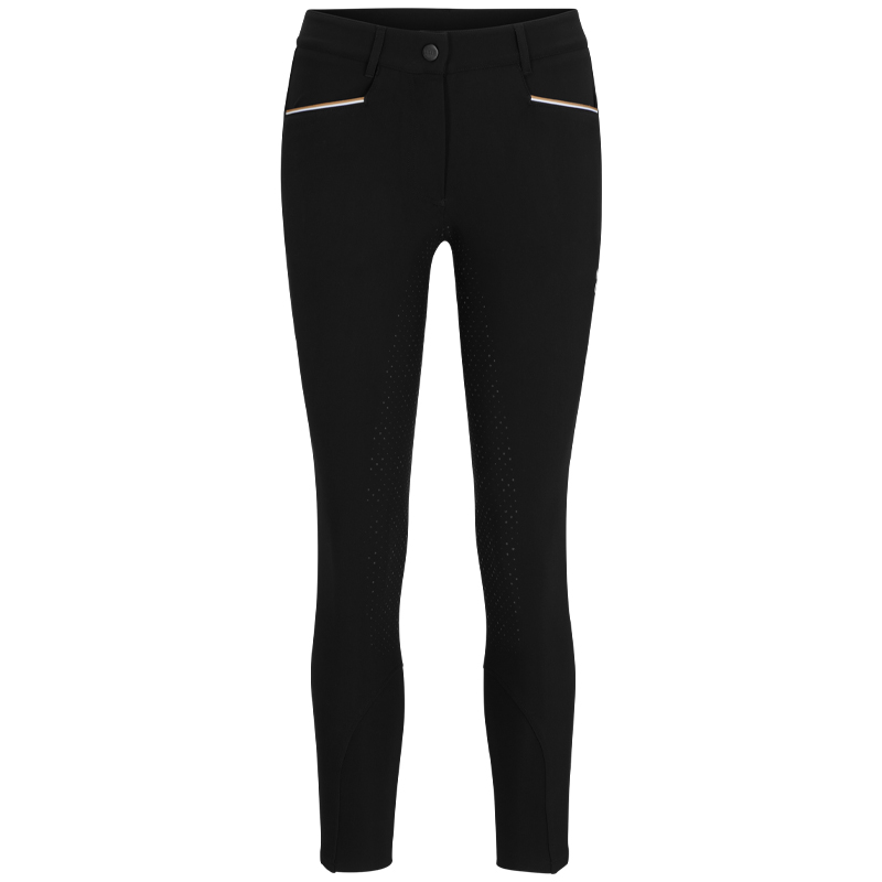 The BOSS Equestrian Heather Full Grip riding breeches for women in black are designed for complete freedom of movement and excellent breathability. These power-stretch breeches feature non-sticky silicone inserts seamlessly integrated into the legs to prevent saddle damage. Details in soft jersey fabric enhance comfort, while signature details provide a distinctive finish.