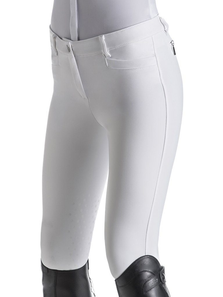 JUMPING EJ riding breeches from the Italian brand EGO7. Women's riding breeches with front pockets and back pockets with zippers. The EGO7 logo is present on the thigh and above the right front pocket.