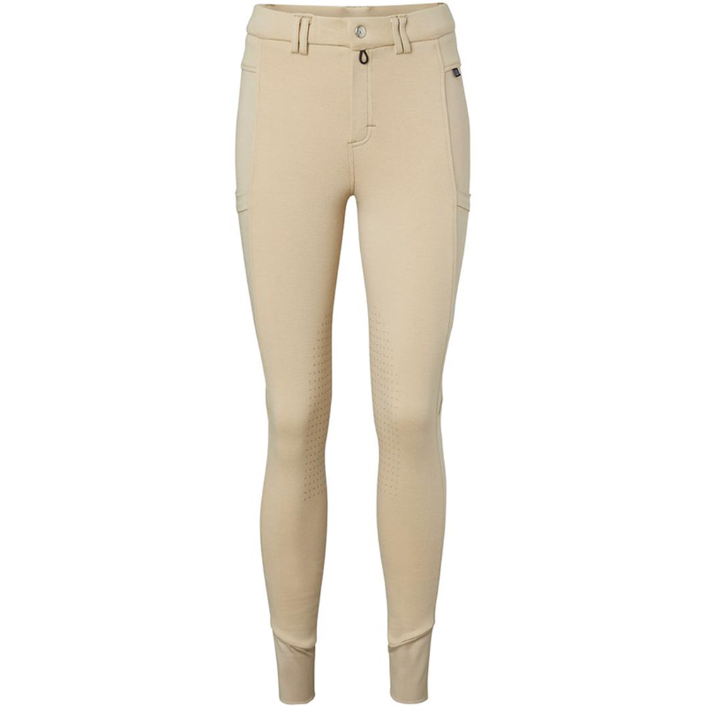 The Mountain Horse Alice GTK Riding Breeches in beige offer a budget-friendly option for riders seeking comfort and functionality. Made from a durable blend of 95% cotton and 5% spandex, these breeches provide both durability and stretch. They feature a light silicone knee grip for added hold and flexibility at the knees. The breeches are equipped with a mobile pocket on both legs, making them practical for carrying your phone during rides. A front YKK zipper and belt loops ensure a secure fit, while elastic cuffs at the bottom of the legs enhance comfort. The Mountain Horse logo adorns the design.