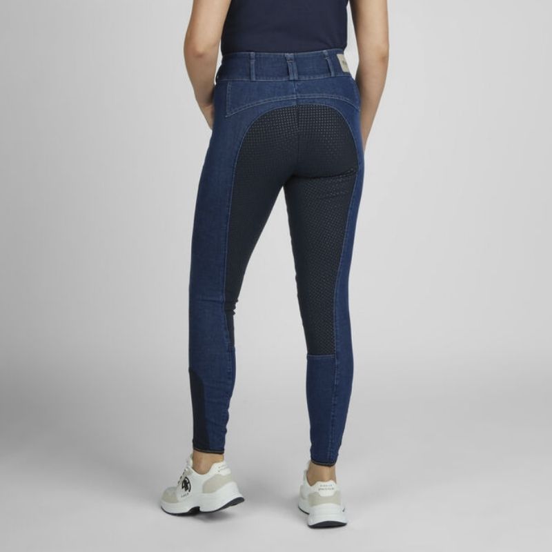 The Pikeur Candela DuraGrip Jeans riding breeches blend a classic denim look with modern performance and comfort. Designed in the popular Candela fit, they feature a high waistband with belt loops for a secure and flattering fit in the saddle. Made from super-stretch 4-way stretch denim fabric, these breeches offer excellent flexibility and freedom of movement while maintaining their shape. The ¾ grip seat panel provides reliable stability in the saddle without restricting comfort. Practical details include stretch leg endings on the outer side for easy entry and a close fit under boots, as well as two slanting pockets without pocket pouches for a smooth, streamlined silhouette.