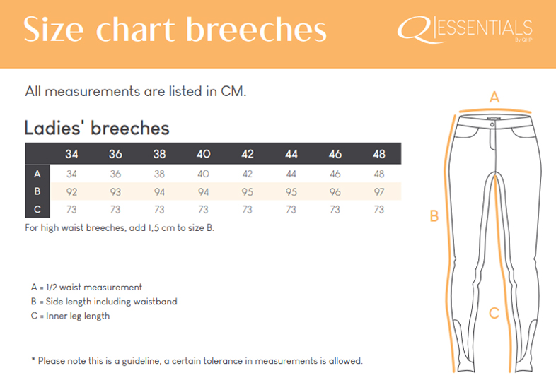 The Q-essentials Basic riding breeches for women are designed for comfort and functionality. Made from an elastic fabric consisting of 95% cotton and 5% elastane, they offer a good fit and flexibility. These breeches feature fabric knee patches and a convenient zipper pocket on the right front. They include crossed belt loops and a wide belt loop at the back. The flex leg ends add extra comfort. Machine washable at 30 degrees, but it's preferable to avoid fabric softener and tumble drying.