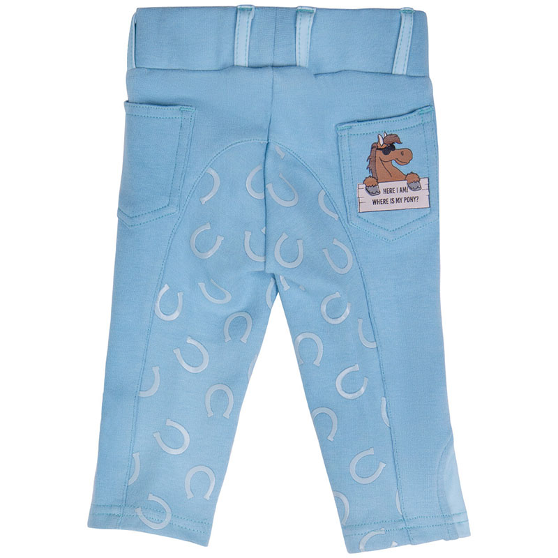 The Bobby riding trousers for children are both cute and functional. These light blue breeches feature the text ""Equestrian Sports"" on the upper left leg. With a full grip pattern shaped like horseshoes, they provide good grip in the saddle, which is important for young riders learning to ride. The trousers are designed to offer a comfortable fit and freedom of movement, making them perfect for both training and competition. They are easy to wash and maintain, which is a practical benefit for active kids.