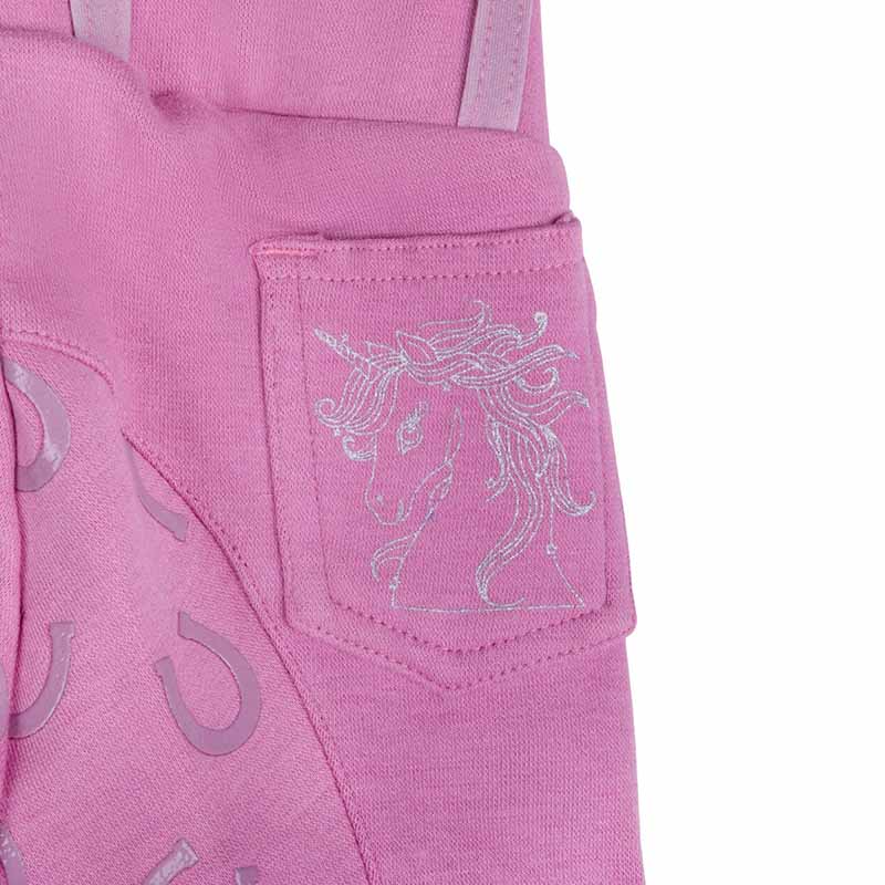 The Bobby riding trousers for children are both cute and functional. These light pink breeches feature the text ""Equestrian Sports"" on the upper left leg, adding a charming touch. With a full grip pattern shaped like horseshoes, they provide good grip in the saddle, which is essential for young riders learning to ride. The fit is tailored for children, allowing freedom of movement during riding and other activities. These trousers are perfect for both training and competition, ensuring comfort throughout the day.