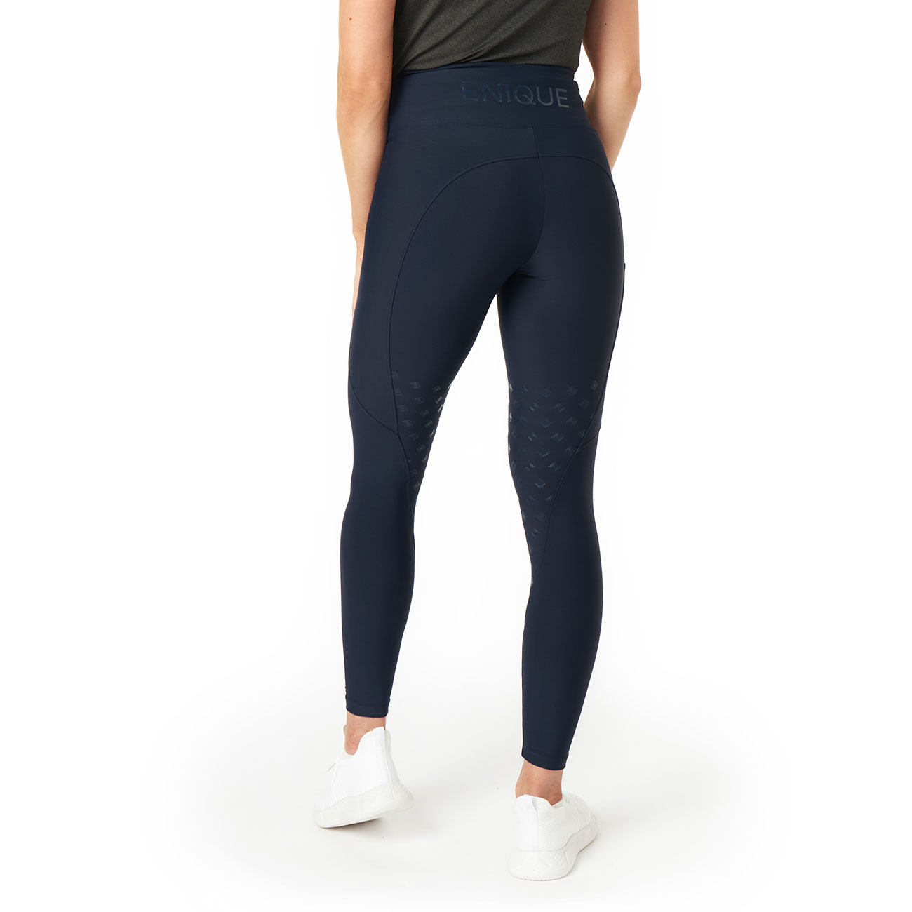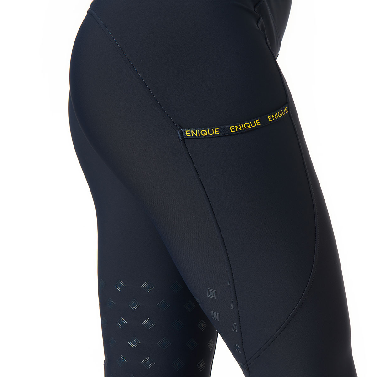 The grip is stylishly matched with a subtle yet bold silicone logo on the lower back, along with contrasting details in Enique's iconic yellow color on an elastic band on one side of the leg. These details give the otherwise simple and sleek navy blue riding breeches a sporty impression and make you stand out from the crowd.
