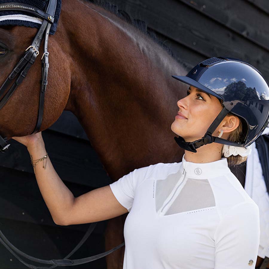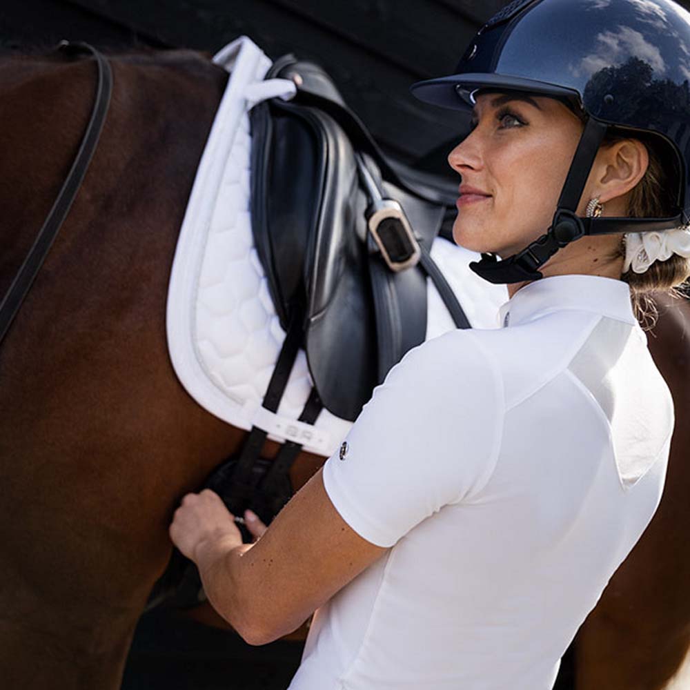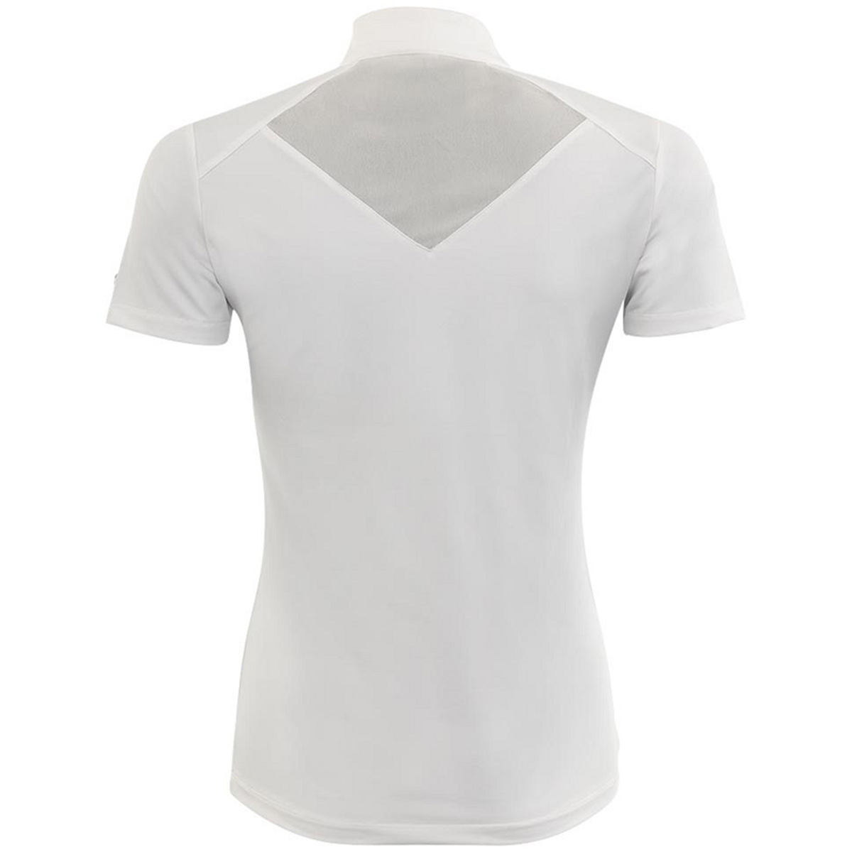 The BR Zapopan Show Top for women is an elegant and functional competition shirt in white. It features a high collar with a zip protector and a stylish mesh insert for extra ventilation. The material is moisture-regulating and quick-drying, ensuring high comfort during wear. The stretchy fabric provides a nice, tight fit. A silver front zipper and imitation diamonds add a luxurious finish.