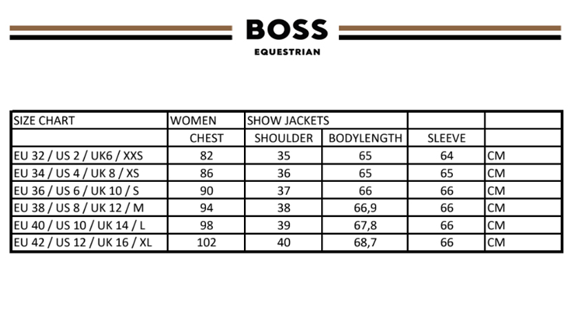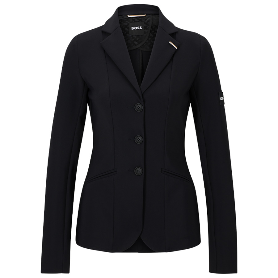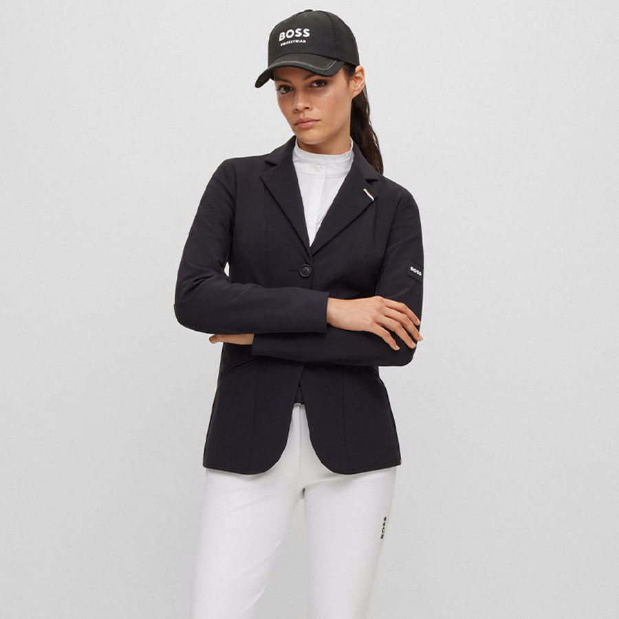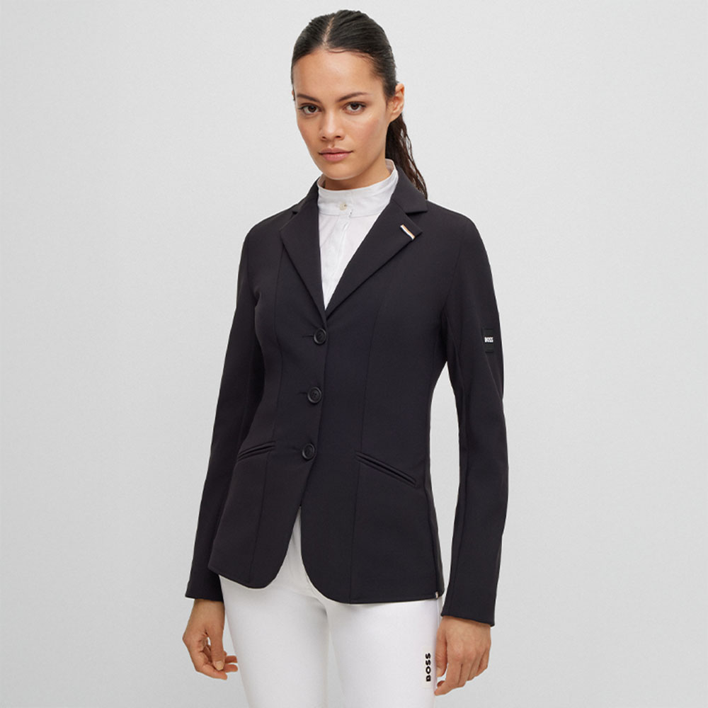 The BOSS Equestrian Anna Show Jacket for women is a sleek black jacket designed for competitions. Its tailored fit and power-stretch material offer both style and freedom of movement. Distinctive details like Boss signature stripes and contrasting logo add a unique touch. The jacket features piped pockets and double vents at the back for added comfort and style. It is also airbag compatible for enhanced safety during competitions.
