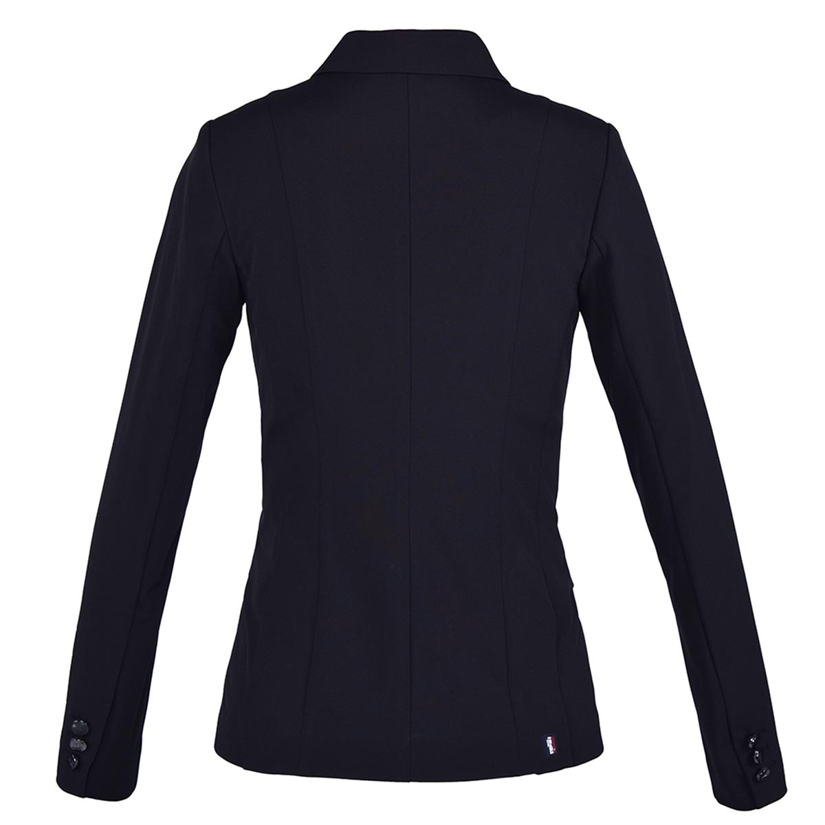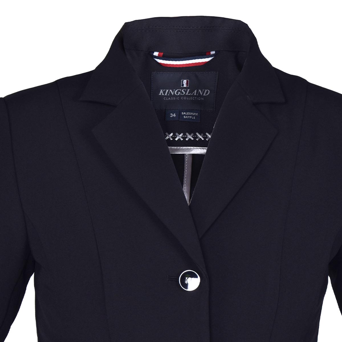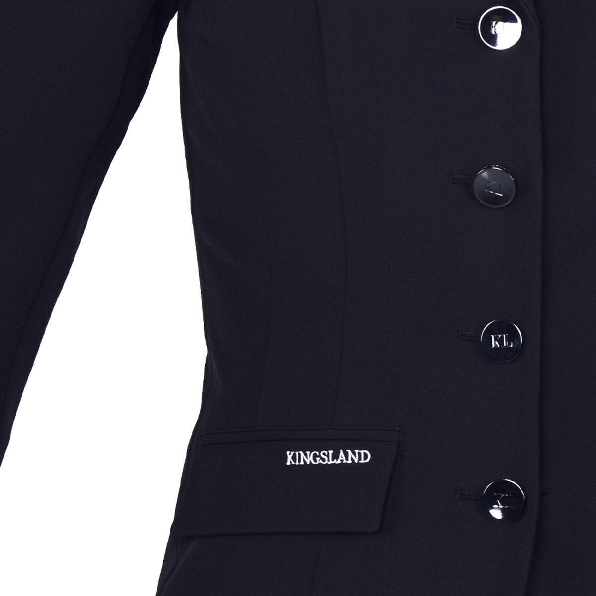 A ladies' competition jacket that combines a classic look with modern functional material. The blend of polyester, elastane, and spandex creates a technical fabric with 4-way stretch for unrestricted mobility and flexibility. The woven softshell fabric provides excellent ventilation through the fibers and dries quickly. Discreet design details such as the Kingsland logo on the pocket, KL logo on the buttons, and a small color icon at the lower back end. Machine washable at 30 degrees.