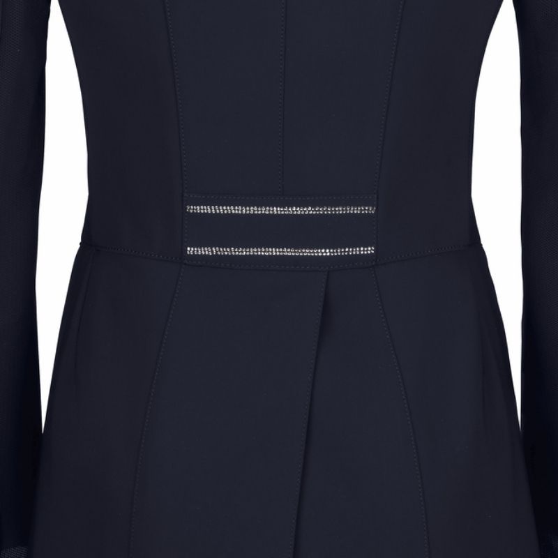 Strategically placed mesh panels along the sides and under the arms, combined with an air-permeable mesh lining, enhance ventilation exactly where it’s needed most. This thoughtful construction supports optimal temperature regulation without compromising the coat’s refined appearance. Visually, the Liliane coat impresses with sophisticated Rhinestone applications that subtly catch the light. These elegant details are echoed on the collar and waist belt, creating a cohesive and polished look.