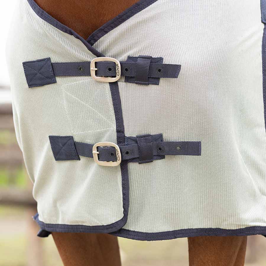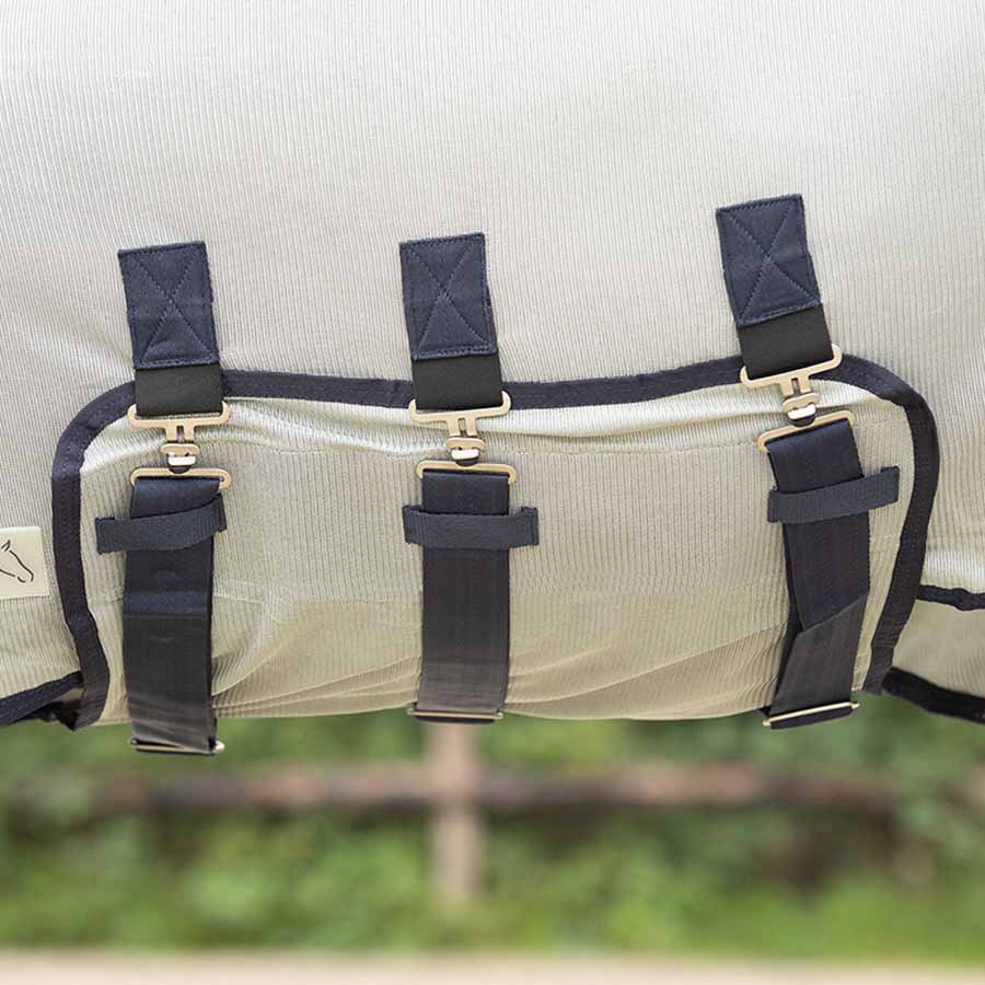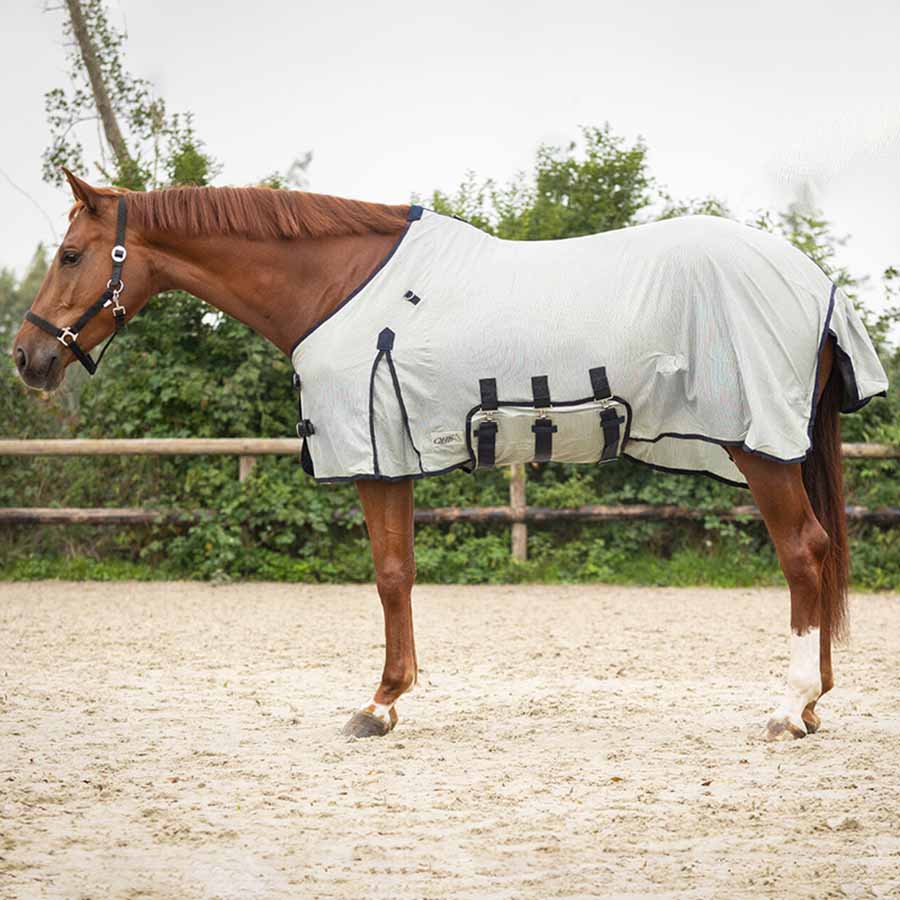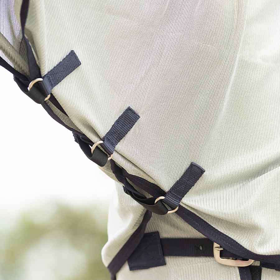 During warm summer months, horses can be bothered by flies, gnats, horseflies, and other pesky insects. This fly rug with a detachable neck and ear bonnet protects your horse against them. The rug features a detachable neck and hood that can be removed when flies and other insects are less active. It has a belly flap that fits nicely around the belly and is secured with both hook-and-loop fasteners and surcingles to prevent shifting.