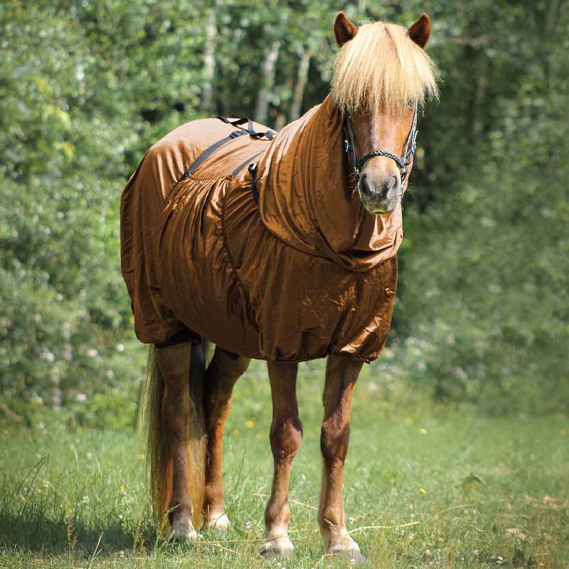The Sweetitch Rug is designed specifically for Icelandic horses, providing essential protection against insect bites, particularly from culicoides midges that can trigger allergic reactions and severe itching. This rug also offers a barrier against sunlight and UV radiation, making it a practical choice for outdoor use.