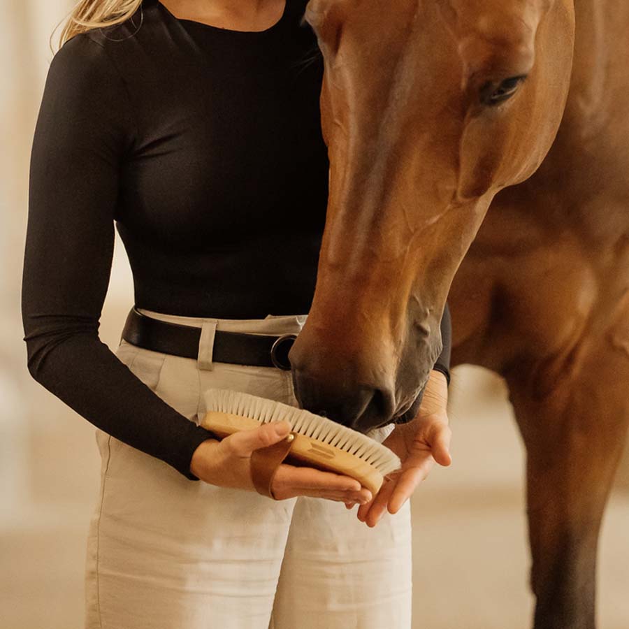 The Overall Brush Body Shine stands out with its use of real horse hair, which is known for its superior ability to polish and shine your horse’s coat. Unlike synthetic bristles, horse hair naturally attracts and lifts dirt, promoting a healthier, shinier coat.