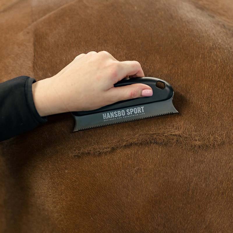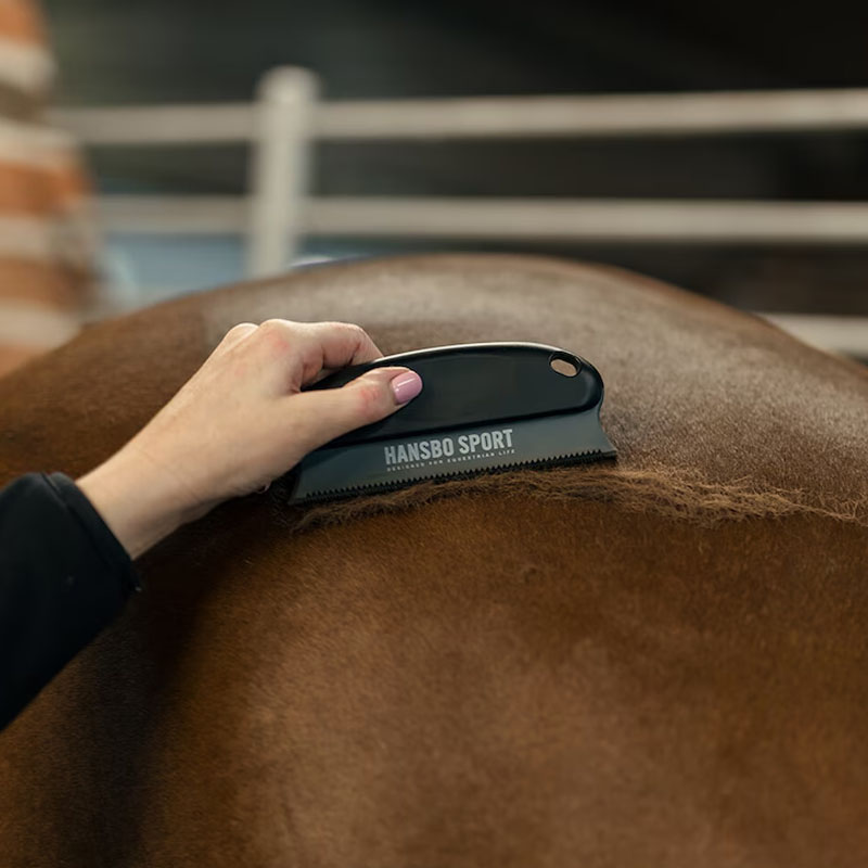 The Hansbo Sport HS Sweat Scraper in Black/Grey is a versatile tool for all pet owners. It's perfect for removing hair from horses, dogs, and barn cats, especially during shedding seasons. The ergonomic handle and soft, comb-like rubber part make it easy to effectively remove excess hair. Additionally, it can be used on saddle pads and teddy protectors. Easy to clean after use.