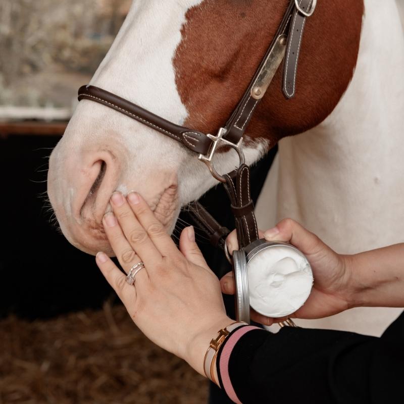 Apply a generous layer of Sunblock to exposed areas such as the horse’s nose, pasterns, and other exposed skin before sun exposure. Reapply as needed, especially if the product is washed off, although the water-resistant formula ensures long-lasting protection.