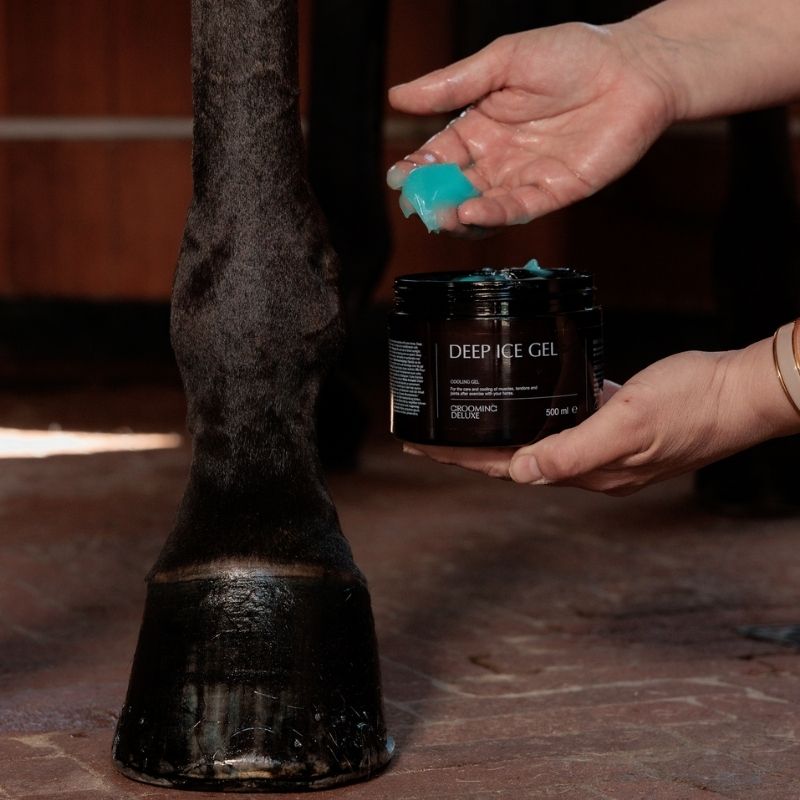 Apply a generous layer of Cooling Gel Recovering Deep Ice Gel to the horse’s legs or muscle areas that need care. For best results, the area can be covered with a bandage to slow down drying time and increase absorption. Avoid applying on open wounds or damaged skin.