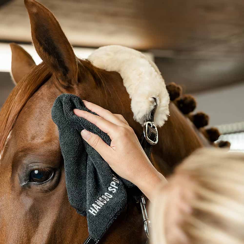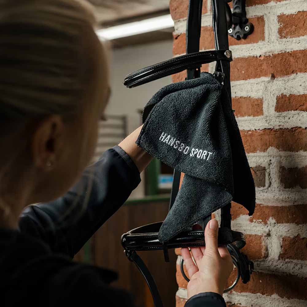 The Hansbo Sport HS Polishing Cloth in black microfiber is both practical and functional. Ideal for giving your horse a final touch, maintaining tack, or polishing boots at competitions. It features an embroidered logo and a small loop for easy hanging. Dimensions are 35x34 cm.