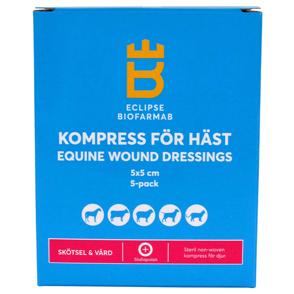 This sterile compress for horses is a practical aid for wound cleaning and dressing. Each compress is individually packaged for easy use and hygiene. Measuring 5x5 cm, it is easy to apply to various wounds and injuries. The compress is sold in a 5-pack, making it convenient to have several on hand when needed. Perfect for both stable and competition settings, where quick and effective wound care is essential.