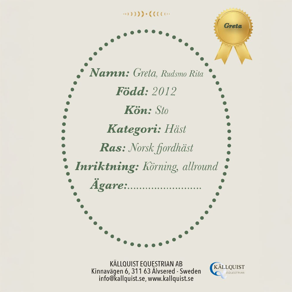 Greta is a palomino hobby horse based on the Norwegian Fjord breed. The hobby horse is made of polyester, with a mane and forelock made of yarn. The stick is made of aspen, a lightweight wood that provides good balance during use.