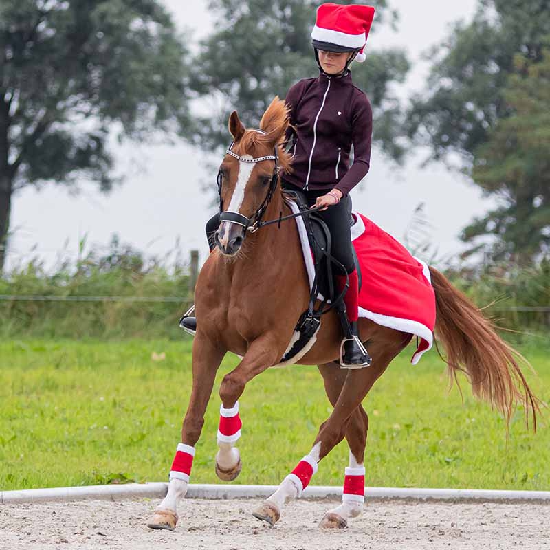 Super cozy, red quarter sheet with a trim of soft faux fur - perfect for both Lucia processions and Christmas shows, or for you who simply want to maximize the Christmas spirit when you're at the stable! Held in place with practical buckles that easily attach to the girth straps.