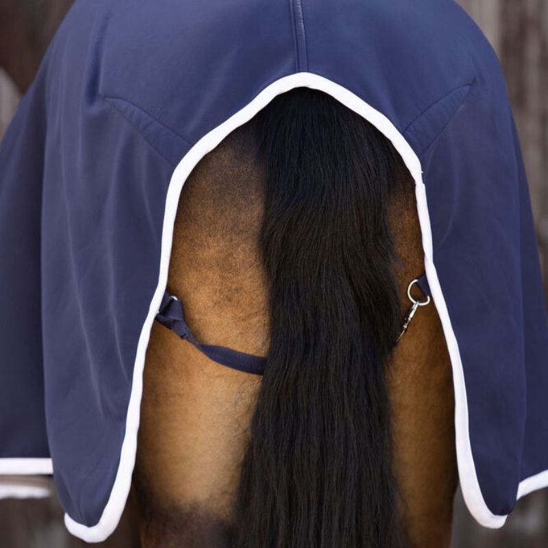 The ESKADRON Jersey Show cooler rug in navy blue is both robust and easy to maintain, making it a practical choice for your horse. It features a fleece lining for added comfort and high breathability, helping to keep the horse dry and comfortable. The rug is equipped with an adjustable girth and tail cord for a secure fit. It also has a contrasting trim and an embroidered logo at the neck, along with an embroidery plate at the front for a stylish look.