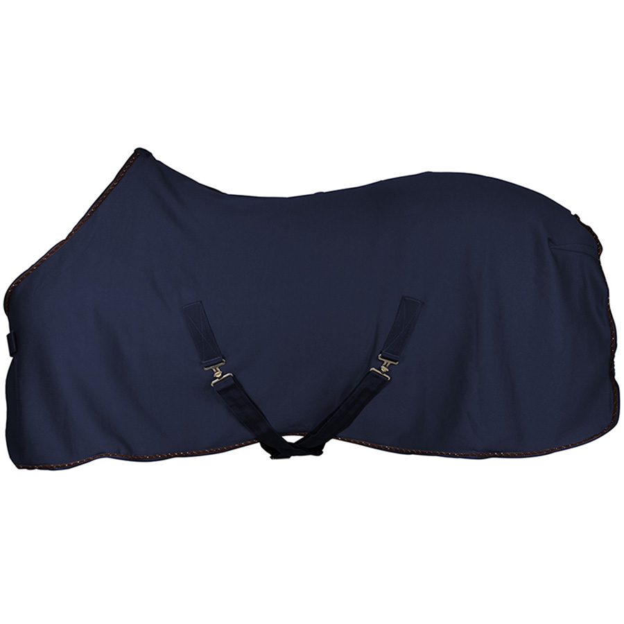 The Hansbo Sport HS Hug Fleece Rug in navy blue is an elegant and functional choice for your horse. It features a smooth outer surface and a soft brushed fleece interior that effectively wicks moisture away from the horse. Decorated with a stylish brown piping, it includes practical cross surcingles and a tail cord for a secure fit. The front closure with Velcro allows for easy adjustment. Perfect for adding your own embroidery.