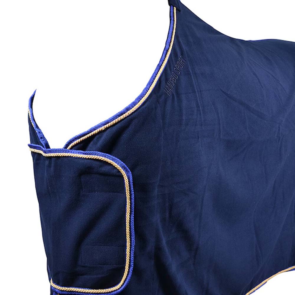 This thick fleece rug from Hansbo Sport is perfect for keeping your horse warm and comfortable. Weighing in at 270 grams, it provides good protection on chilly days. The rug features a flat front that makes it easy to embroider, allowing you to customize it to your style. It closes simply with Velcro at the front, making it easy to put on and take off. The navy fleece material is both soft and durable, and the contrasting yellow piping adds a stylish detail. Please note that the rug is delivered without cross surcingles, giving you the freedom to choose what works best for your horse.