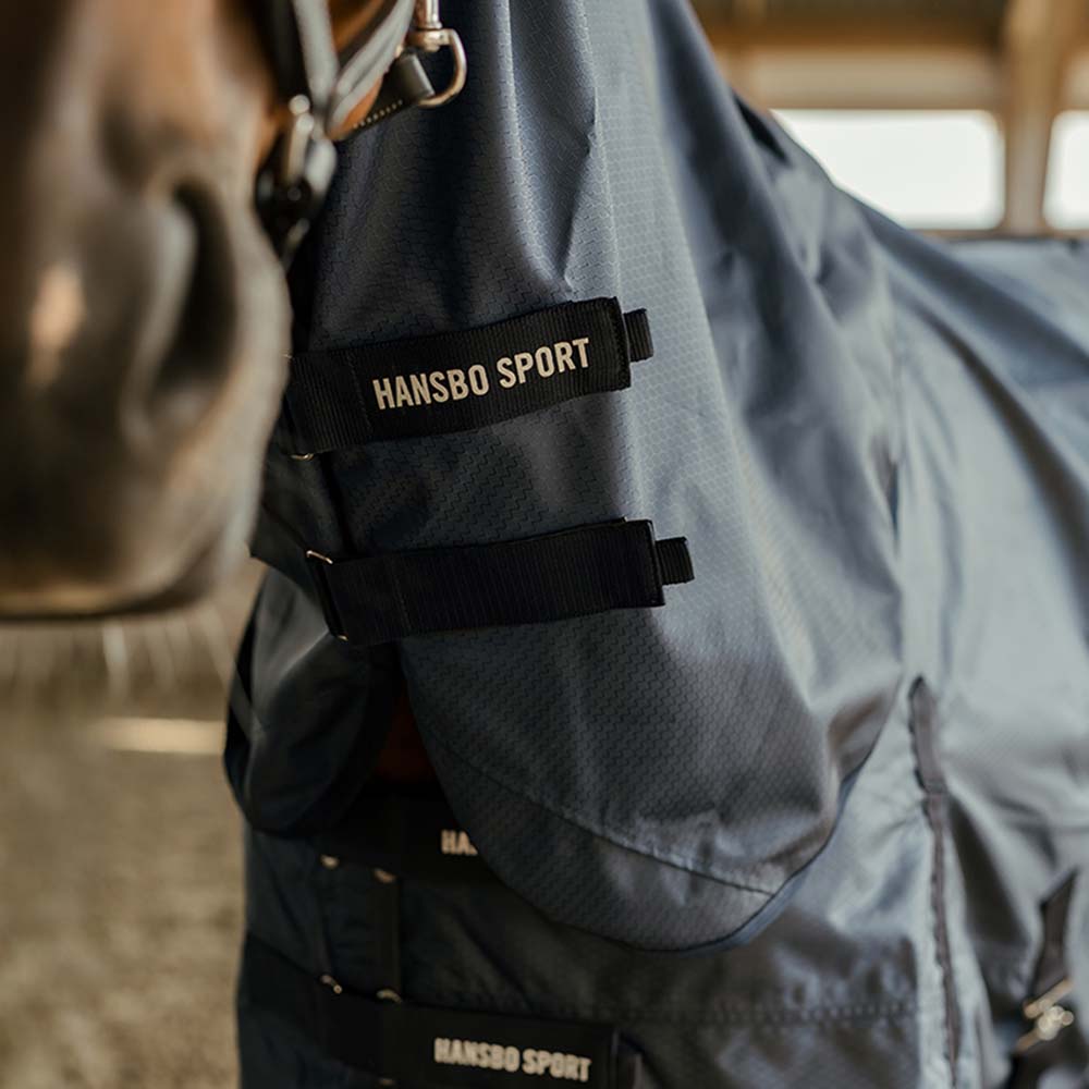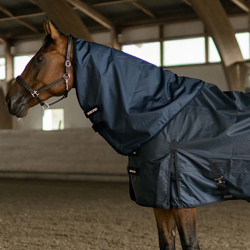 The Hansbo Sport Neck Cover HS Solid 600D 0g in navy blue is a practical addition to your horse's rain rug. It's unlined and made from durable Diamond ripstop polyester, making it both robust and lightweight. The glossy, anti-static nylon lining reduces the risk of chafing, and the double Velcro fastenings ensure a secure fit. This neck cover is compatible with the Solid rain rug and offers a water column of 4000 mm and a breathability of 3000 MVT.