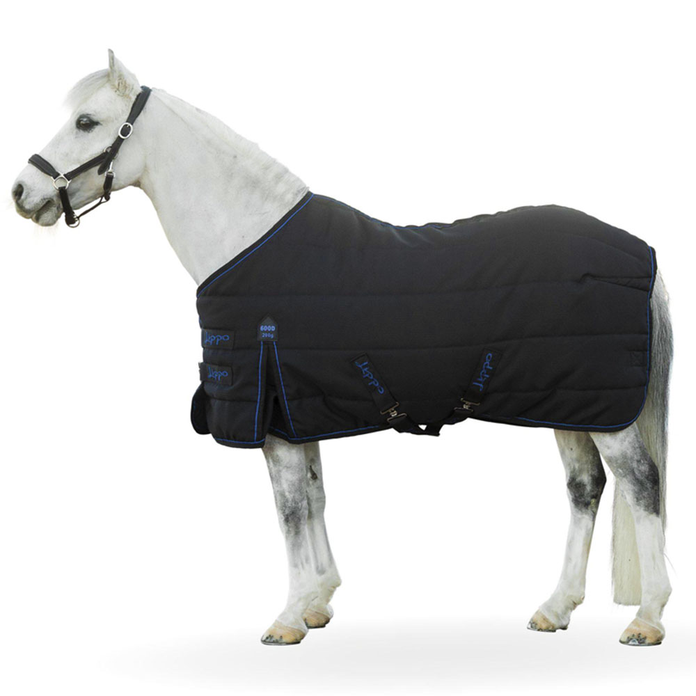 The Lippo Supreme 600D 200g Stable Rug is a quilted black rug with ripstop, ideal for keeping your horse warm and comfortable in the stable. It features attachments for a neck cover and is equipped with hook-and-loop chest fastenings, cross surcingles, and shoulder gussets for optimal fit. The detachable tail cord and leg strap attachments provide added security. With a nylon lining and polyester filling, this rug offers extra warmth, and it comes in various sizes with either single or double chest fastenings depending on the size.