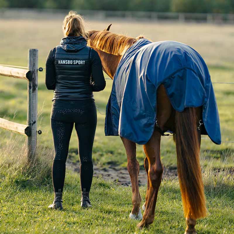 The Hansbo Sport HS Solid 600D 0g rain rug in navy blue is designed to keep your horse dry and comfortable in all weather conditions. Made from Diamond ripstop polyester, this rug offers durability and rain protection with a 4000 mm water column. The shiny, anti-static nylon lining reduces the risk of chafing, while the super soft faux fur at the withers enhances comfort. The rug features double hidden front closures, shoulder gussets, cross surcingles, and a tail protector for optimal fit and function.