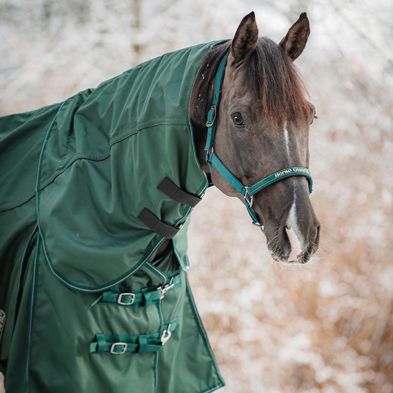 Durable, waterproof rain blanket with a detachable neck and 0g fill. The unlined turnout rug is made from green 1200D nylon material and has been designed with several practical features, such as quick-release buckles at the chest, high shoulder gussets, and twin cross surcingles, as well as light-reflective details for extra visibility.
