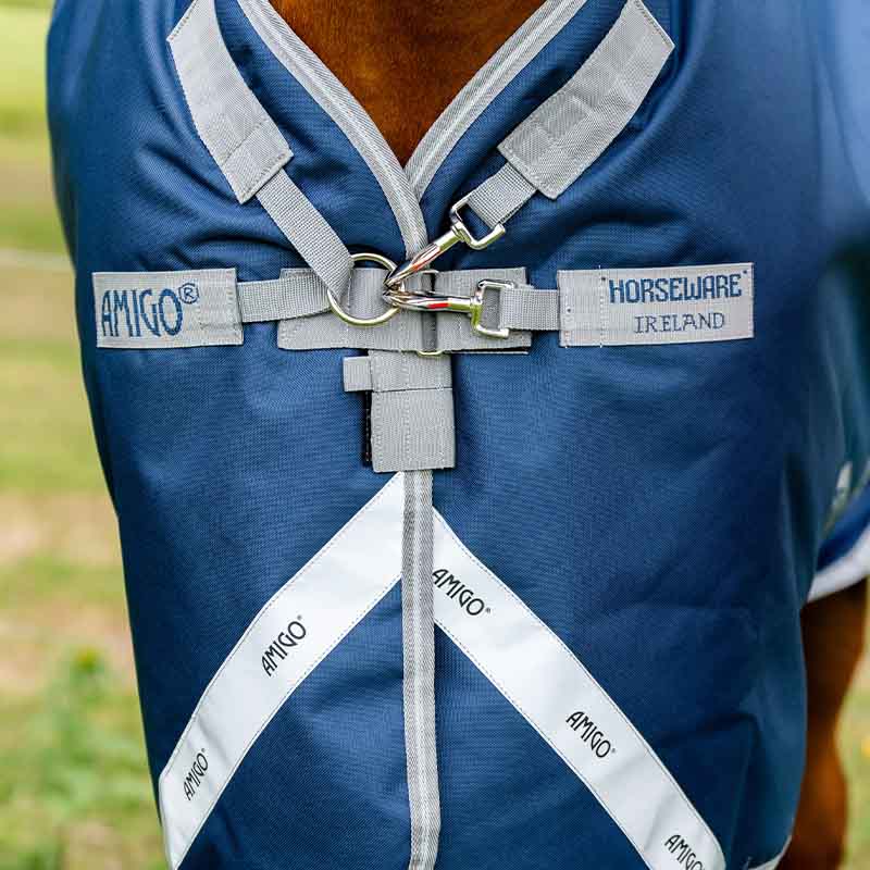 The Amigo Plus 1200D 50g rain rug by Horseware is crafted from strong 1200D polyester, ensuring it is both waterproof and breathable. It features a V-front closure that reduces pressure on the horse's shoulders for added comfort while grazing. A detachable hood is included for ultimate versatility. The rug also has dual leg arches to maintain freedom of movement and a secure fit under the belly, along with reflective strips for increased visibility.