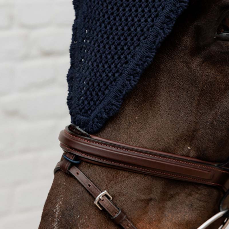Kentucky Horsewear's hand-knitted long fly veil in navy combines a stylish look with practical features. The extended front piece attaches to the noseband to stay securely in place throughout the ride, while the soundless ears reduce noise and distractions – making it an excellent choice for noise-sensitive horses. A discreet model without logo, perfect for custom or sponsor embroidery.
