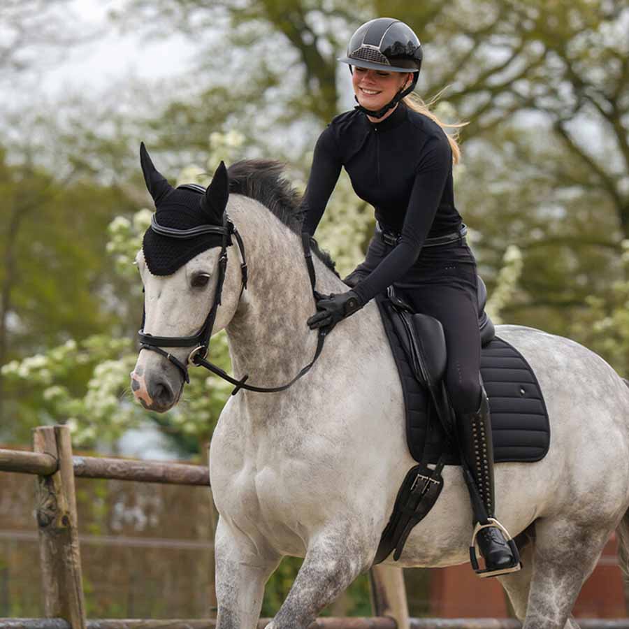 The QHP Salerno Ear Bonnet is a stylish and functional choice for your horse. This black ear bonnet is made from 100% cotton and features elastic ears crafted from softshell material, ensuring a high level of comfort combined with the fine fabric. The stylish crocheted design is complemented by a loop with the QHP logo on the back of the bonnet.
