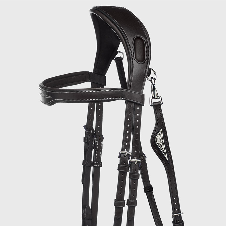 The bridle's wide headpiece evenly distributes pressure over the horse's neck, while the anatomical, softly padded browband, thanks to an innovative angled attachment, ensures that there is no uncomfortable pressure on the horse's ears. The flat cheekpieces are easy to adjust, the noseband is completely removable, and the jawband, which has also been adorned with Equiline's logo as a stylish, luxurious detail, is quickly and easily fastened with a convenient quick-release buckle.