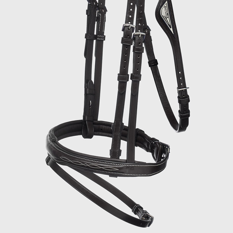 Black, anatomical bridle with decorative pattern stitching from renowned Equiline - made of soft, high-quality Italian leather, and developed with the horse's comfort and well-being as the top priority. Designed with half the distance between each hole to allow for the most precise and adjustable fit possible.