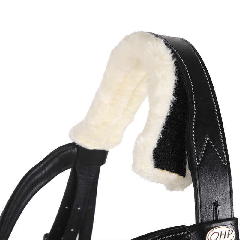 Anatomical bridle from QHP, designed with a specially shaped noseband, a headpiece that allows extra room for the ears, and equipped with both soft leather padding and a removable faux fur lining. Ideal for horses prone to chafing or having slightly irritated, extra sensitive skin.