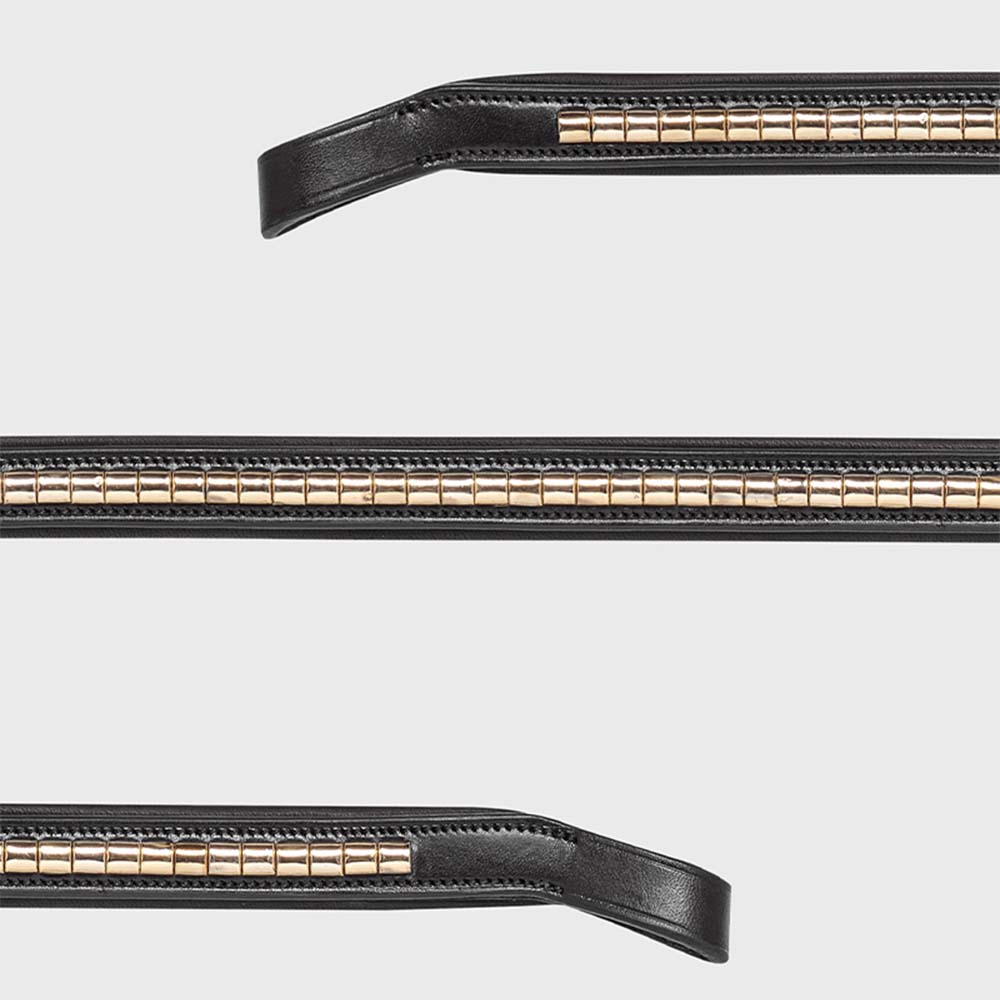 Black, softly padded browband with gold trim - specially designed to combine high elegance with maximum comfort. The browband has been designed with an anatomical fit that, through a clever and innovative angle at the bridle attachment, ensures that the browband does not rest and create any uncomfortable pressure on the horse's sensitive ears.