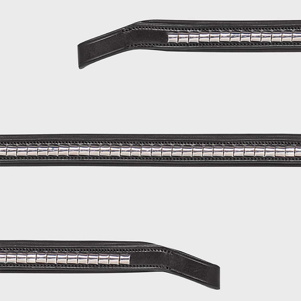 Black, softly padded browband with silver trim - specially designed to combine high elegance with maximum comfort. The browband has been designed with an anatomical fit that, through a clever and innovative angle at the bridle attachment, ensures that the browband does not rest and create any uncomfortable pressure on the horse's sensitive ears.