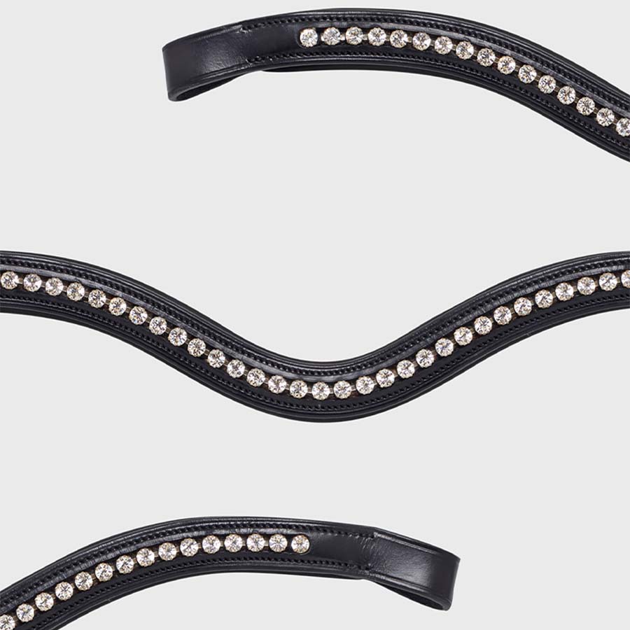 Luxurious, U-shaped browband in black, adorned with rhinestone details and soft padding - specially designed to combine high elegance with maximum comfort. The browband has been designed with an anatomical fit that, through a clever and innovative angle at the bridle attachment, ensures that the browband does not rest and create any uncomfortable pressure on the horse's sensitive ears.