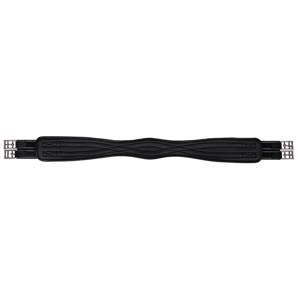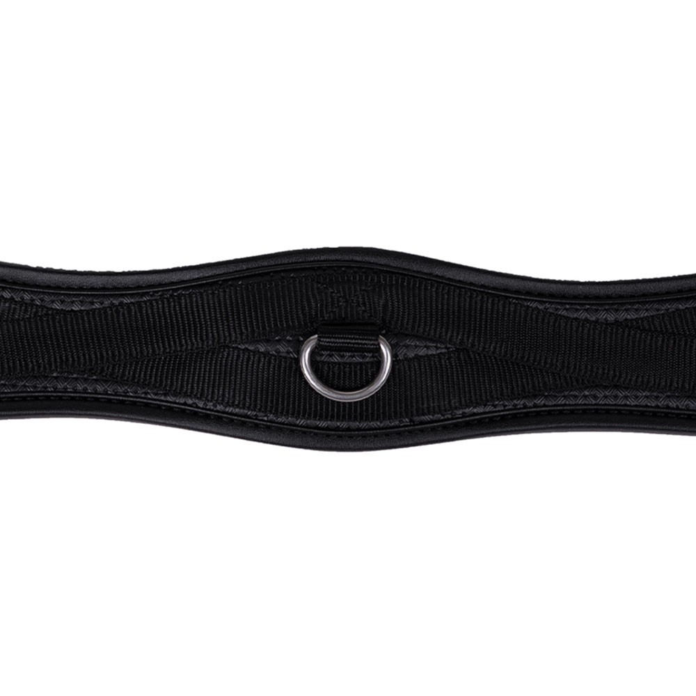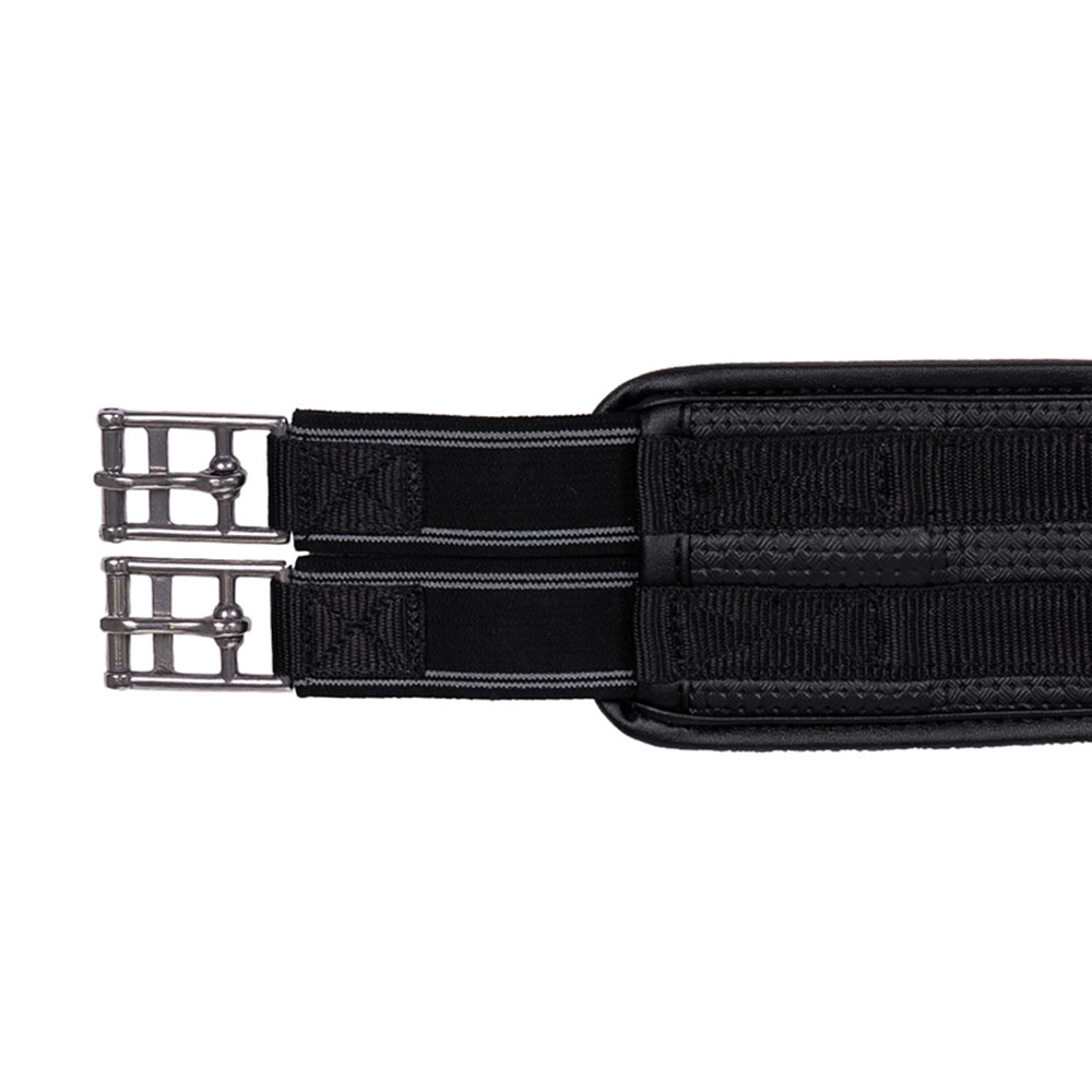 Black anatomical girth from QHP, designed to provide the horse with improved comfort and freedom of movement. The general purpose girth has elastic on both ends, as well as a ring on the underside for attaching auxiliary reins. The model also features stainless steel roller buckles to make it easier when tightening the girth.