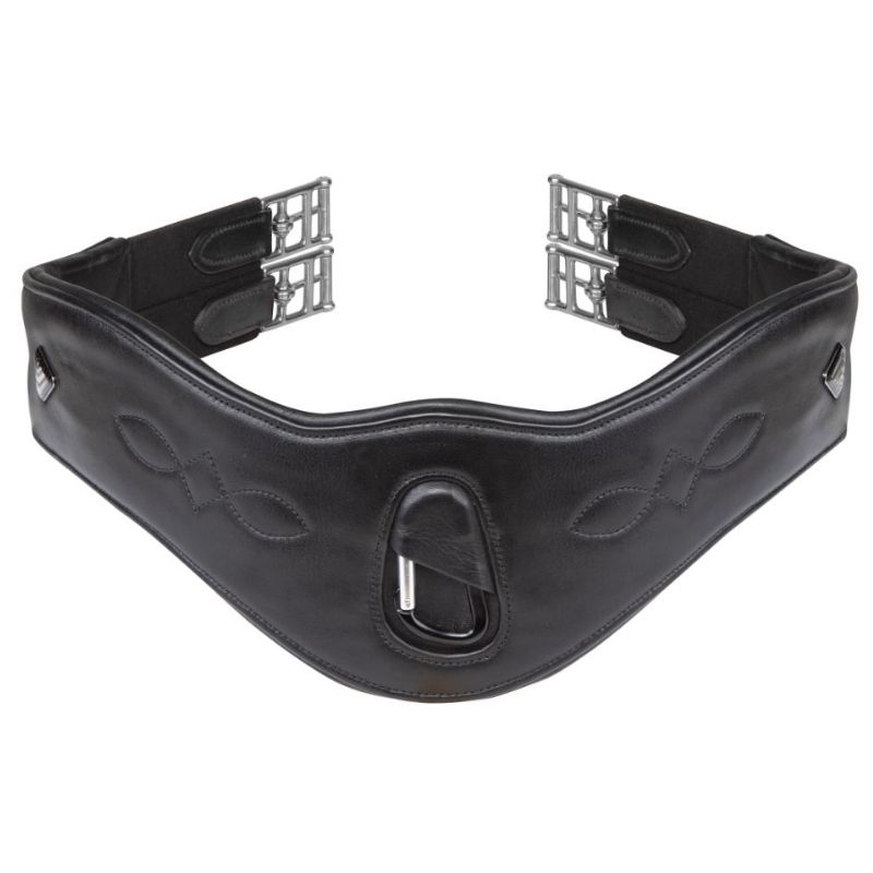 Introducing the Velociti LUSSO Elastic Anatomical Girth in a sleek black color. This girth is designed to provide optimal comfort and fit for your horse, featuring elastic material that allows freedom of movement and reduces pressure points. Ideal for riders seeking a blend of functionality and style.
