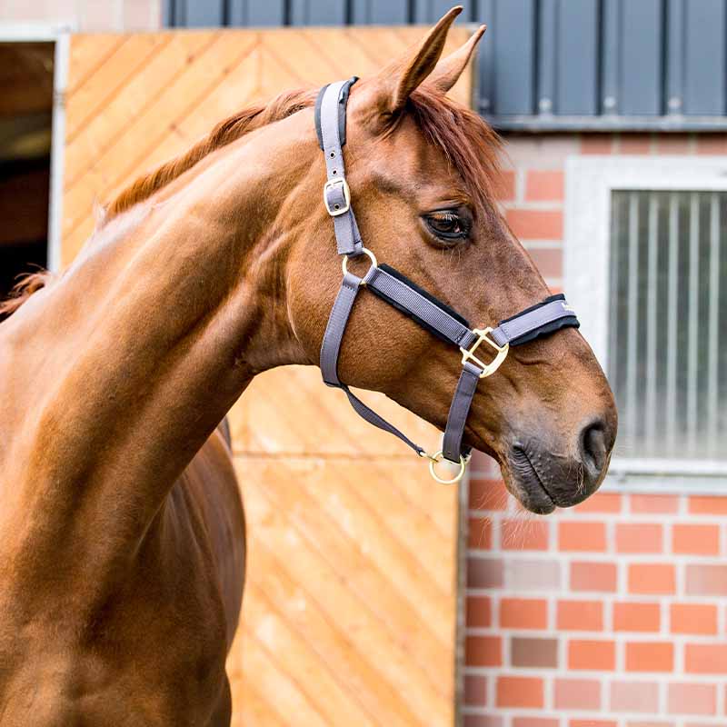 The grey halter is designed with beautiful gold-colored metal buckles and can easily be adjusted to fit your horse around the nose and cheekpieces.