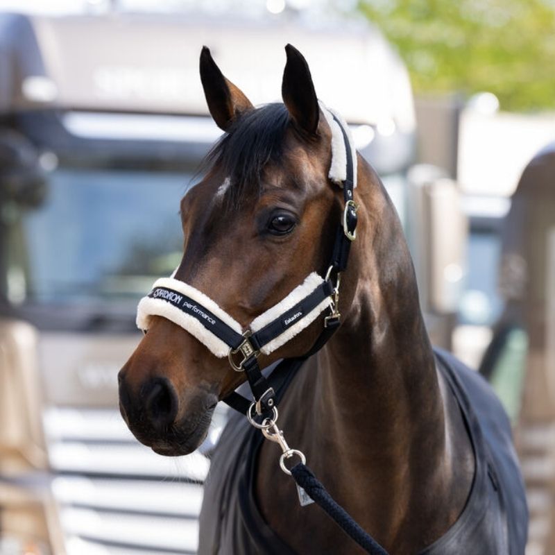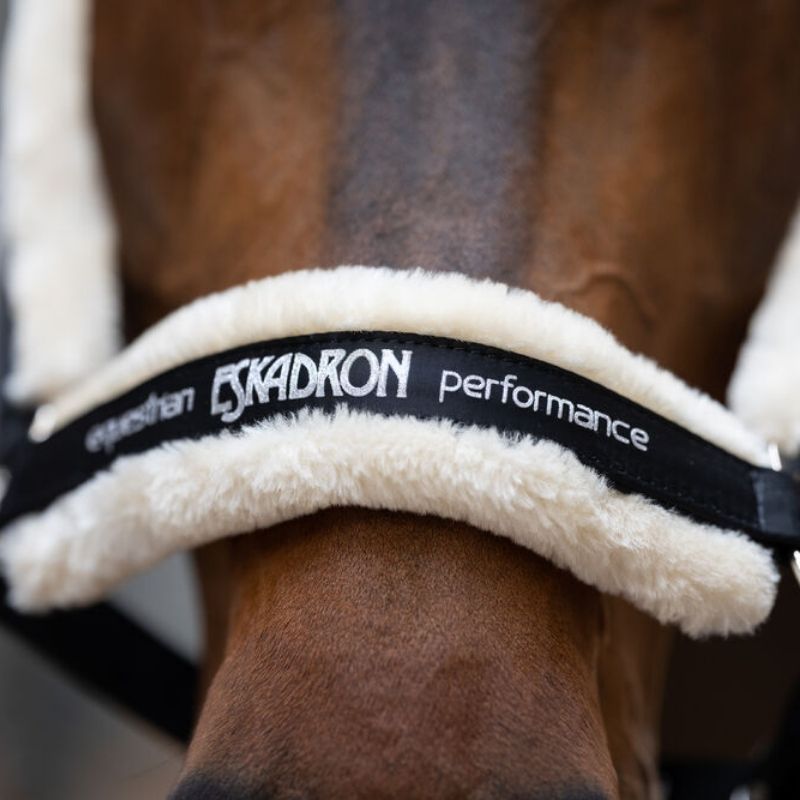 The Eskadron Halter Fauxfur Double Pin in black is a high-quality halter featuring a glossy outer fabric and durable webbing on the inside. It includes double pin buckles for symmetrical adjustment and is also adjustable under the chin. The halter is equipped with easy-care, removable FauxFur linings on the nose, neck, and cheekpieces, providing extra comfort for the horse.