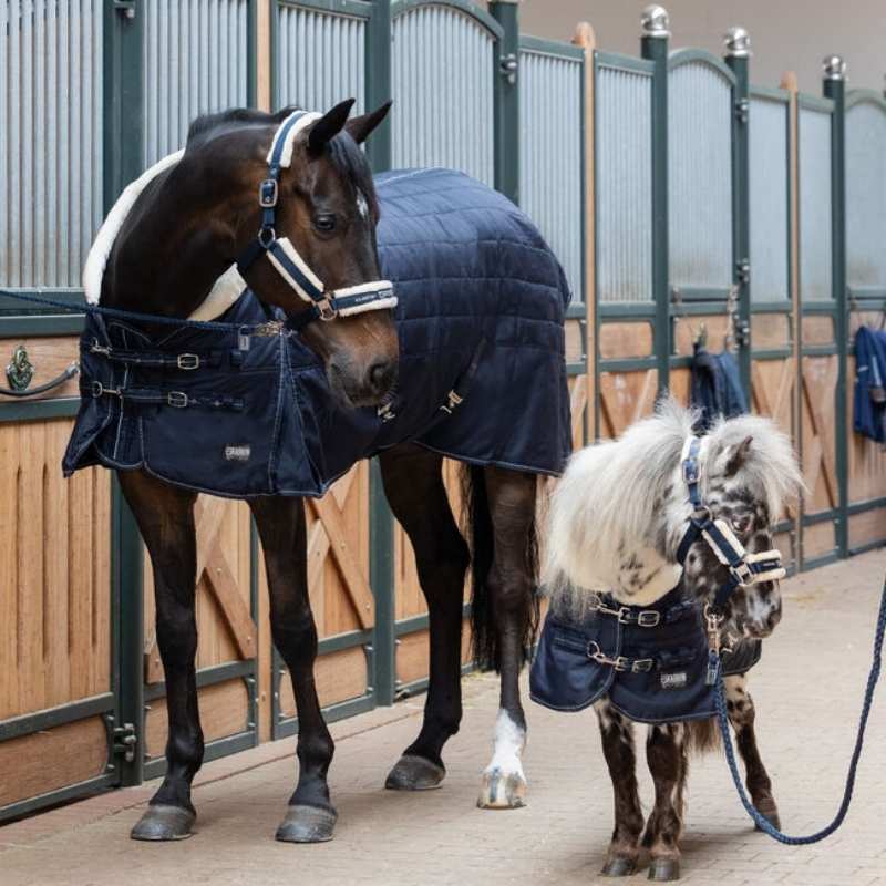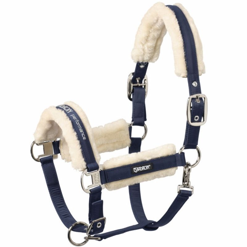 The Eskadron Fauxfur Double Pin Halter in navy blue is a high-quality halter featuring a glossy outer fabric and durable webbing on the inside. It includes double pin buckles for symmetrical adjustment and is also adjustable under the chin. The halter is equipped with easy-care, removable FauxFur padding on the nose, neck, and cheekpieces, providing extra comfort for your horse.