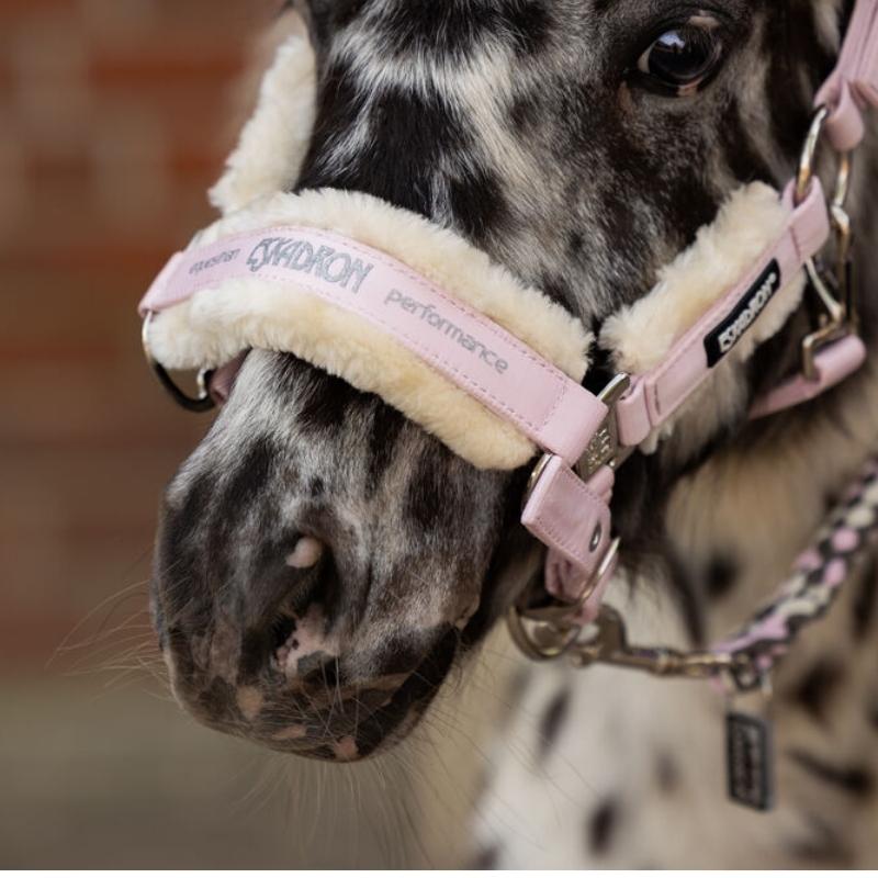 The Eskadron Halter Fauxfur Double Pin is a high-quality halter in a lovely pink color. It features a glossy outer fabric and a durable webbing on the inside for added strength. The halter is equipped with double pin buckles for symmetrical adjustment and can also be adjusted under the chin. It includes easy-care, removable FauxFur linings on the nose, neck, and cheekpieces for extra comfort.