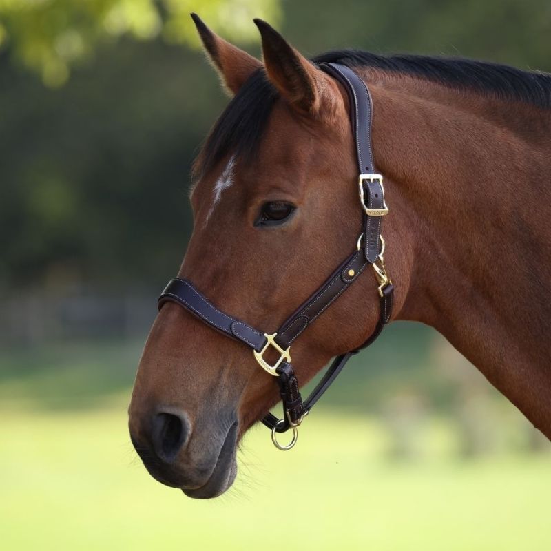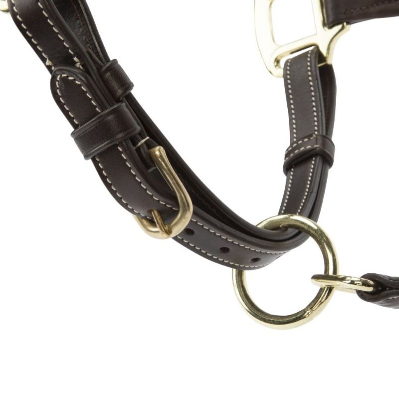 The Velociti LUSSO Lorca Leather Halter provides luxurious comfort for your horse with its beautifully crafted brown European leather. It's anatomically designed at the head and nose to relieve pressure, while the cut shape creates space around sensitive areas. The halter features generous anti-shock leather padding around the headpiece, nose, and cheeks, with softly rounded edges for added comfort. It attaches at the headpiece with double ends, has an adjustable headpiece, and a convenient clip-on rounded chin strap. Reinforced with nylon for extra durability.