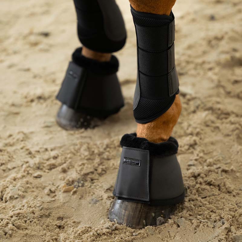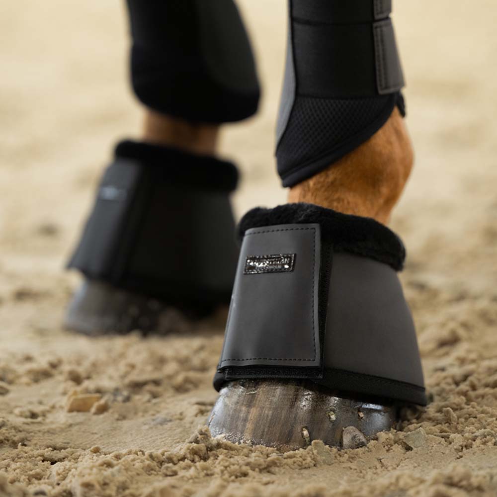 Upgrade your style with these high-quality bell boots in faux leather with a matte finish. Designed in an elegant black color, they feature super soft teddy fleece faux fur on the inside against the horse’s leg. The bell boot is about 6 mm thick with neoprene lining on the inside that effectively prevents injuries to the heel bulb. It closes with a wide velcro strap decorated with an Equestrian Stockholm patch.